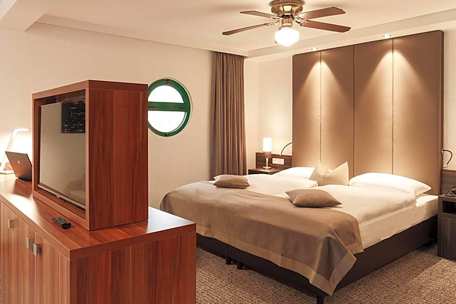 This Anglo-American-style room features twin beds a ceiling fan, a desk, a bathroom with shower, a TV and a telephone.